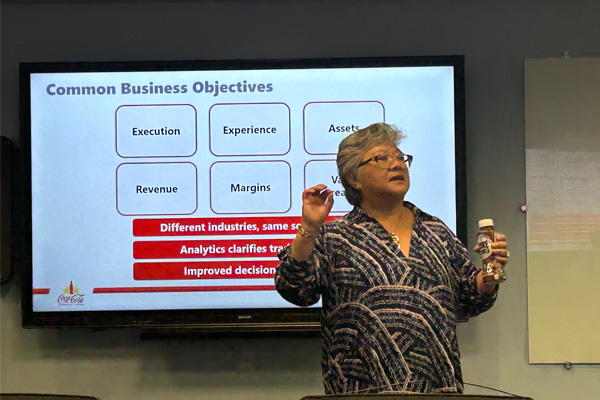 The lecture highlighted the 5 ways data can deliver value, showcased a scorecard used by most organizations when aligning analytics to business objectives, and revealed how analytics power decision‑making in both hospitality and the beverage industry. “I compared the hospitality business model with ours at Coke Florida to show that despite the industries operating differently, the analytic logic is the same,” said Forsyth. “Whether you’re running a hotel or managing a beverage portfolio, data helps you understand what’s changing, why it’s happening, and what to do next.”